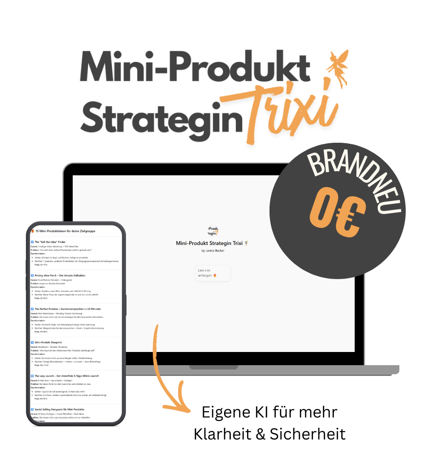 Und das Beste: Du musst nicht raten oder brainstormen: mit Trixis smartem Fragenprozess & 15 fertigen Ideen findest du deine Produktidee schneller, klarer und ohne Überforderung.